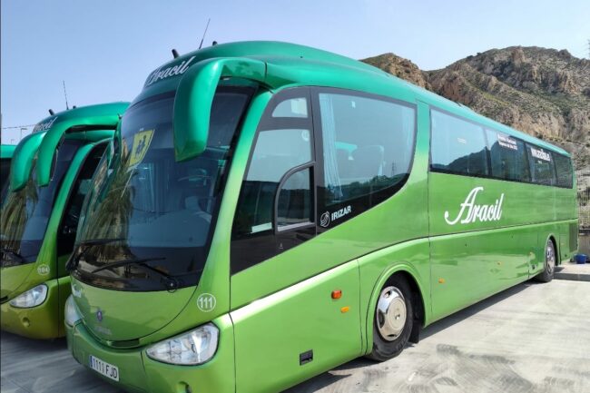 En Aracil disponemos de autobuses seguros y modernos, con capacidades que van desde 54 hasta 63 plazas. Nuestros vehículos están equipados con comodidades como WiFi, reproductor de DVD, baño, cinturones de seguridad etc,. Además, contamos con modelos que incluyen bar, neveras y mesas para ofrecerte una experiencia de viaje aún más placentera.
